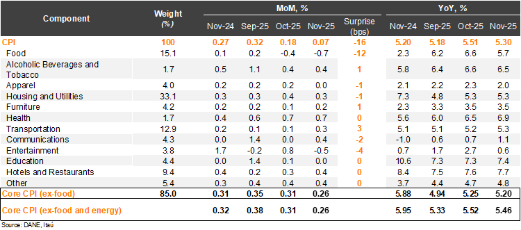 After four consecutive months of rising annual inflation, November brought some relief. Consumer prices rose 0.07% MoM in November, well below the Bloomberg market consensus of 0.20% and our 0.23% call. The main positive contributors in the month were housing and utilities (+0.28%; +9bps), hotels and restaurants (+0.38%; +4bps) and transport prices (+0.29%; +4bp). Meanwhile, food prices dropped by 0.7% MoM, subtracting 14bps. Food prices explained most of the surprise relative to our forecast. Consumer prices excluding food rose by 0.26% (+0.31% one year earlier), while inflation excluding food and energy increased by 0.26% MoM (+0.32% one year ago). On an annual basis, headline inflation fell by 21bps from October to 5.3% in November, while core inflation fell by 6bps to 5.46%. Year-to-date inflation sits at 5.15% (5.13% in October), well above the central bank’s 3% target.
