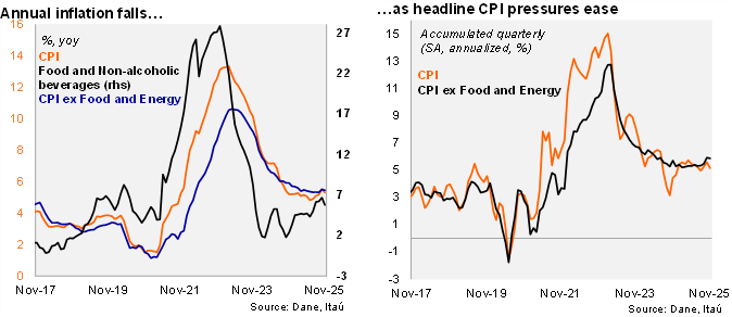 Non-durable goods inflation ticks down, while services inflation remained high. Non-durable goods inflation (mainly food) came in at 4.86% YoY, falling by 35 bps from the previous month. Meanwhile, energy inflation increased by 6 bps to 3.0% YoY, amid a low base effect. Durable goods inflation remained stable from the previous month at a low 0.63% YoY. Services inflation dropped by 13 bps to 6.26% (9.51% peak in September 2023). At the margin, we estimate inflation accumulated in the quarter reached 5.2% (SA, annualized, stable from 3Q25). Core inflation stood at 5.9%, up from 5.5% in 3Q25 (SA, annualized).