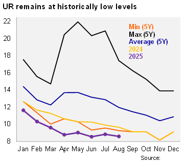 Private and self-employment payrolls were the main job creators in August. In the quarter ending August, employment increased by 2.9% YoY (+3.2% in July; +3.2% in the 2Q25). This annual increase was driven by a 4.9% YoY increase in private salaried posts (+2.7% in 2Q25), while self-employment posts rose by 2.8% (+5.7% in the previous quarter). Conversely, public sector jobs fell by 1.5% (-0.8% in the 2Q25). Financial and insurance services, real estate, construction and transport sectors were key job drivers this month.