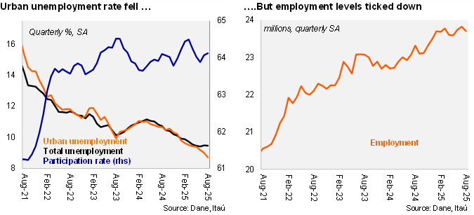 In August, the unemployment rate remained at historically low levels, despite employment falling sequentially. According to DANE’s August labor market report, the national unemployment rate reached 8.6%; down 1.1pp over one year, while the urban unemployment rate stood at 7.8% in August, a drop of 2.2pp over one year, below the Bloomberg market consensus of 8.3% and our 8.1% call, and the lowest level since records began (2001). Employment rose by 1.7% YoY in August (+3.3% YoY in July), while the labor force increased by 0.5% (+2.1% in the previous month). The participation rate fell by 0.6pp from August 2024 to 63.9%. Sequentially, employment dropped by 0.5% (+0.3% previously), while the unemployment rate (SA) remained stable at 9.0%. Meanwhile, the urban unemployment rate (SA) dropped to 8.0% (-0.3pp MoM; BanRep’s NAIRU: 10.2%).