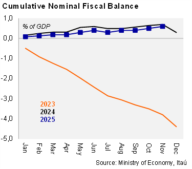 Our Take: Our primary surplus forecast for 2025 and 2026 stands at 1.5% of GDP, in line with the official forecast presented in the 2026 Budget bill. The disciplined management of the fiscal accounts supports this forecast.