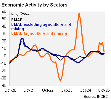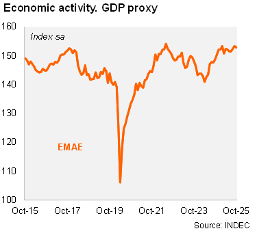 According to the EMAE (official monthly GDP proxy), activity fell by 0.4% MoM/SA in October, after rising by 0.6% in September (revised up from 0.5%). Consequently, activity increased by 0.8% in the quarter ended in October after growing 0.3% QoQ/SA in 3Q25 (in line with national accounts data recently published). On an annual basis, activity rose by 3.2% in October and by 3.4% in the quarter ended that month (+3.3% yoy in 3Q25). Thus, the statistical carryover for 2025 stood at 4.4%.