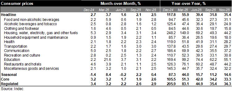 According to Argentina’s statistical office (INDEC), consumer prices rose by 2.5% MoM in November, accelerating for the third consecutive month. The print was above the central bank's survey median of 2.3% MoM but in line with our forecast. On an annual basis, inflation rose to 31.4%, from 31.3% in October. Annualized quarterly inflation in November rose to 31.5%, up from 28.1% in the previous month.