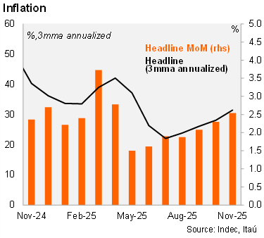 Our take: Our YE25 inflation forecast stands at 30.5%. INDEC will release the CPI for December on January 13. Preliminary estimates from the central bank survey suggest a median monthly reading of 2.1%. We still pencil in a gradual disinflation process during 2026 (20.0% in YE26) given our forecast for a stable ARS in real terms.