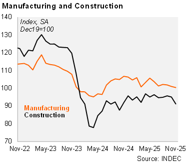 Manufacturing fell sequentially in November. The IPI manufacturing index decreased by 0.6% MoM SA in November, marking the third consecutive drop. Thus, industry output fell by 1.2% QoQ SA in the quarter ended in November, following a 1.8% contraction in the previous month. On an annual basis, manufacturing fell by 8.7% in November and by 4.0% in the quarter ended in that month. All sectors contracted on an annual basis in November.