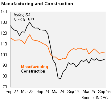 Our take: Although construction and manufacturing showed mixed results in September, both indices contracted sequentially in 3Q25. Therefore, we anticipate that the monthly GDP proxy (EMAE) for September, to be published on 25 November, will indicate that the economy experienced a technical recession in 3Q25. Our GDP growth forecast for 2025 stands at 3.8%, primarily due to a high carryover from last year.