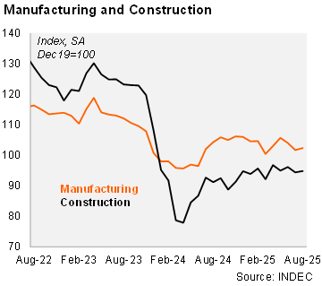 Construction also expanded in August. The construction index rose by 0.5% mom/sa in August, after falling 1.9% in the previous month. Moreover, construction rose by 0.5% qoq/sa in the quarter ended in August (2.2% qoq/sa in 2Q25). Construction activity increased by 0.4% yoy in August and by 4.7% yoy in the quarter ended in that month. Employment in the sector increased by 4.6% relative to July 2024 (figures have a one-month lag). According to a qualitative survey, 64.9% of those involved in private construction expect no changes in activity levels over the next three months. Meanwhile, 7.4% expect an increase and 27.7% anticipate a decline. Among companies primarily engaged in public works, 28.9% anticipate a decrease in activity levels during the next three months, while 60.0% expect no change and 11.1% expect an increase.