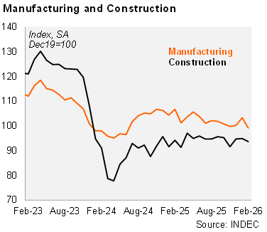 The manufacturing component of the IPI declined by 4.0% MoM/SA in February, reversing the 3.1% MoM/SA increase recorded in January. Despite this setback, industrial output edged up 0.1% QoQ/SA in the quarter ended February. On an annual basis, manufacturing output fell 8.7% YoY in February and 5.3% YoY in the quarter ending that month. Sectoral performance remained weak, with only one out of nine subsectors posting year‑on‑year growth in February.