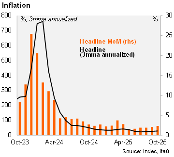 Our take: Our YE25 inflation forecast stands at 29.5%. The appreciation of the ARS following the mid-term election should ease pressure on tradable prices in the coming months. INDEC will release the CPI for November on December 11. Preliminary estimates from the central bank survey suggest a median monthly reading of around 1.9% (0.1 p.p. below the previous estimation).