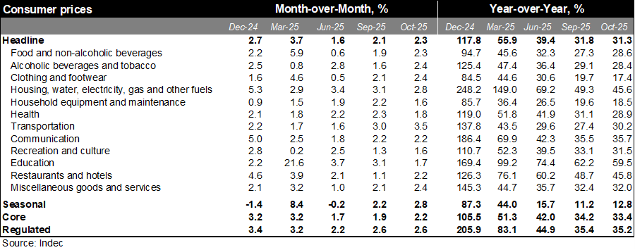 The monthly core reading also accelerated in October. The core measure rose by 2.2% MoM in October, up from 1.9% in the previous month amid weaker ARS. Moreover, the annual core reading fell to 33.4%, down from 34.2% in September. Prices for regulated products increased by 2.6% MoM and 35.2% YoY. Finally, seasonal product prices increased 2.8% MoM in October and 12.8% YoY in October, up from 11.2% YoY the previous month.