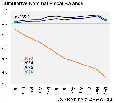 Our Take: Our 2026 primary surplus forecast stands at 1.5% of GDP, in line with the official forecast presented in the 2026 Budget, which was approved in extraordinary sessions by Congress at the end of 2025. This forecast is supported by disciplined fiscal management.