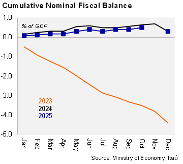 Our Take: Our primary budget surplus forecast for this year is 1.5% of GDP, which is in line with the official target presented in the 2026 Budget bill. The disciplined management of the fiscal accounts supports this forecast. Although no date has been set for a vote on the 2026 budget bill in Congress, the government may try to move forward with its discussion after December 10, when the new Congress takes office.