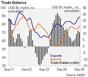 Exports increased in 3Q25. Total exports rose by 13.9% yoy in the period, following a 1.4% gain in 2Q25. Agricultural exports, including manufactured agricultural products, rose by 19.7% yoy in the period (from -1.1% yoy in 2Q25) boosted by the temporary reduction of exports duties. Other industrial products were flat in 3Q25 (0.0% yoy in the same period), down from an increase of 6.6% yoy in 2Q25. On a sequential basis, exports rose by 49.8% qoq/saar in September.