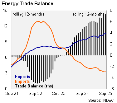 The energy trade surplus widened in September. The rolling 12-month balance reached USD 7.4 billion in September, above USD 7.2 billion in the previous month. Energy exports rose by 17.5% yoy in 3Q25, while oil imports fell by 17.8% yoy in the same period.