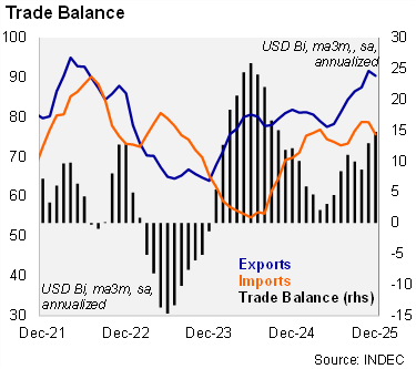 Exports increased in 4Q25 led by higher sales of primary products. Total exports rose by 14.3% yoy in the period, following a 18.1% gain in the quarter ended in November. Agricultural exports, including manufactured agricultural products, rose by 18.1% yoy in the period (from 21.1% yoy) boosted by the temporary reduction of exports duties. Other industrial products increased by 5.8% yoy in the quarter ended in December, down from 9.1% yoy gain previously. On a sequential basis, exports rose by 19.2% qoq/saar in December.