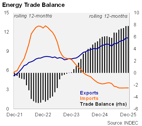 The energy trade surplus widened in 2025. The rolling 12-month balance reached USD 7.8 billion in December, above USD 5.7 billion in 2024. Energy exports rose by 17.8% yoy in 4Q25, while oil imports rose by 2.5% yoy in the same period. Thus, the energy trade balance reached a new historical surplus amid higher production.