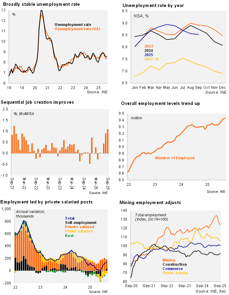 The unemployment rate reached 8.5% in the third quarter of the year, 0.2pp down from 3Q24, while in line with both the Bloomberg consensus and our call. Employment rose 1.5% YoY (0% in 2Q), and the labor force did so by 1.2% (0.6% in 2Q).On a seasonally adjusted basis (SA), employment increased 1.1% from the June quarter (-0.2% QoQ/SA in 2Q). The unemployment rate (SA; 8.4%) is down 0.5pp from the 2Q peak. Nevertheless, the unemployment rate has hovered at or above the upper bound of the BCCh’s estimated NAIRU (7-5-8.5%) for more than a year. Labor market informality sits at 26.2%, down 0.8pp over one year. Informatics, administration services and health were key job creating sectors over twelve months. The annual employment change continues to show an offset between positive formal job creation (+170 thousand YoY), lifted by the private sector (+90 thousand) while public posts adjust and informal posts tick down.