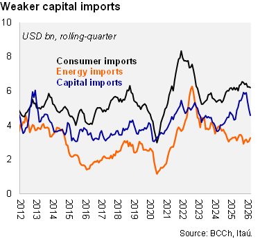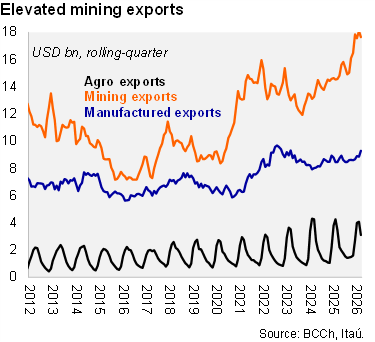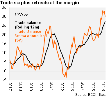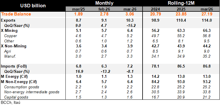 A trade surplus of USD 3.1 billion was recorded in March (Itaú: 3.0 billion; USD 1.9 billion in March 2025), lifted by mining and manufacturing while import dynamics reflect a tick up in fuels. As a result, the rolling 12-month trade balance reached USD 27.2 billion (USD 23.9 in 2025; USD 20.8 billion in 2024). Exports grew 14% year-on-year in 1Q26 (22% in 4Q25), boosted by the 22% mining gain. Within mining, copper exports rose by 13% in 1Q26, while gold (USD 1.2 billion), silver and lithium (USD 1.1 billion) exports all roughly doubled over one year. Manufactured exports were up 10% in the quarter, supported by chemical and food sales. Separately, total imports rose by 1.5% YoY in 1Q26 (8% in 4Q25) with durable consumer goods broadly flat over one year. Capital goods imports remain elevated yet grew at a slower 6.2% YoY in the quarter (24% in 4Q25), lifted by machinery and equipment, while vehicle imports shrunk. While overall energy imports were broadly flat between 1Q25 and 1Q26, gasoline and diesel imports surged by a respective 30% and 81% YoY in March, reflecting higher global energy prices, in turn, driven by the Middle East conflict.