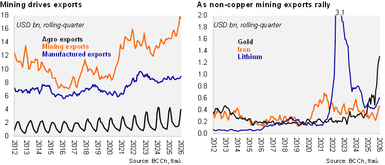 A trade surplus of USD 3.8 billion was recorded in January (Itaú: USD 4.2 billion), lifted by mining and manufacturing while imports softened. As a result, the rolling 12-month trade balance reached USD 21.6 billion (USD 20.8 in 2025; USD 21 billion in 2024). The annualized quarterly trade balance sits at a higher USD 28 billion as mining exports rebound. Exports grew 8.5% year-on-year in January (18.7% in December), boosted by the 12.1% mining gain. Within mining, copper exports rose by 7.9%, meanwhile gold exports increased 33% (USD 389 million), and lithium exports jumped 28% (USD 248 million). Manufactured exports were up 13.9% (lifted by food and chemicals), unwinding weaker dynamics registered in 4Q25. Exports of cherries fell 20% at the start of the year amid overall agriculture softness. On the import side, total imports contracted by 3.1% YoY (6.6% in December) with consumer goods falling by a similar rate. Imports of durable consumer goods slowed (led by computers), and foods imports declined. Energy imports fell 28% YoY amid low global oil and gas prices. On the other hand, capital goods increased 11.4% (7.7% in December), lifted by transportation vehicles while machinery and cargo vehicles declined.