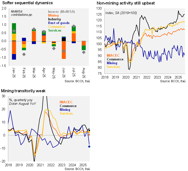 Recent activity momentum has been driven by non-mining activity. IMACEC data suggests the economy grew 1.8% YoY in the August quarter (3.1% in 2Q and 2.5% in 1Q25), hindered by the 7% mining drop, while commerce (5.4% YoY) and services (3.1% YoY) remain upbeat. On a sequential basis, total activity momentum came to a halt, falling by 1.2% QoQ/SAAR (the first decline since mid-2024). The pace of the mining activity unwind, amid several supply shocks, is evolving at the swiftest speed since early 2019. However, non-mining sectors grew by a swift 2.1% QoQ/SAAR (0.1% in 2Q25), sequentially pulled up by manufacturing.