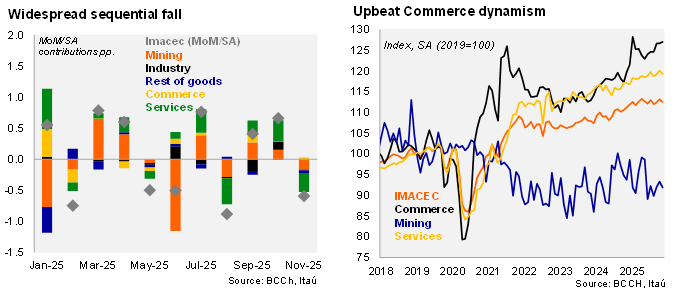 According to the BCCh, the monthly GDP proxy (IMACEC) for November rose by 1.2% YoY, below the Bloomberg median (2.2%) but closer to our call (1.6%). The print takes place on the back of recent weak sectorial data and labor market data. The annual expansion in November was the lowest since August (0.3%) and was primarily driven by persistently lower mining output (contracted annually for the past six months) and a slowdown in services. On a sequential basis, activity in November fell by 0.6% MoM SA (+0.6% in October), contracting for the first time since August, with declines across all components except for commerce (0.3% MoM SA). Services fell by 0.6% MoM SA. If activity remained flat in December, the GDP proxy would have risen by 2.2% in 2025 (NSA), slightly below our growth forecast for the year.
