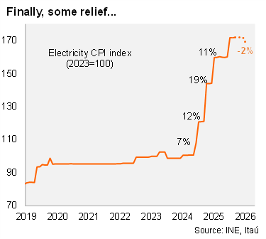 Our take: Barring significant changes to other components of the electricity bill, this update would lead to a price drop in the electricity component on the CPI. Based on the new information and expert estimates, our electricity inflation forecast for January 2026 would fall from +2% (contribution 0.07%) to -2% (contribution -0.07%). If the market adjusts accordingly, the curve will reprice January from 0.5% to 0.4%. A caveat comes in the way the adjustment is implemented as settlement delays may be applied in different formats, like direct discounts (relevant for CPI) or installment credits (not considered in CPI). Minister Pardow emphasized the need to "wait for the institutional process to unfold," noting that electricity companies still need to provide input before any final decision is made. In this sense, there are still doubts about the moment and magnitude of the upcoming adjustment. Regarding past adjustments, second round effects of those increases have been limited. The National Statistics Institute (INE) uses prices directly reported by electricity companies to calculate the electricity component of the CPI basket, which carries a weight of 2.2%.