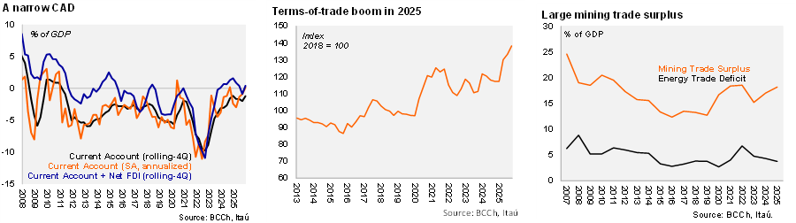 A terms-of-trade surge closed the year. Exports of goods grew by 21% YoY in 4Q25 (12% in 2025), while imports rose by 8% (11% in 2025). On the mining front (+34% YoY in 4Q25), prices (+29% YoY) rather than volumes (+5% YoY) led the strong export close to 2025. The domestic demand outlook remained positive, with imports of capital goods rising 24% YoY in 4Q25 (and 25% during the full year). Imports of consumer goods slowed to 5% (10% in 2025). The services deficit narrowed at the margin amid a boom in tourism to Chile during 2025. With rising mining prices, the income deficit also increased (to USD 5.2 billion in 4Q25; USD 3.6 billion in 4Q24) amid favorable FDI returns.