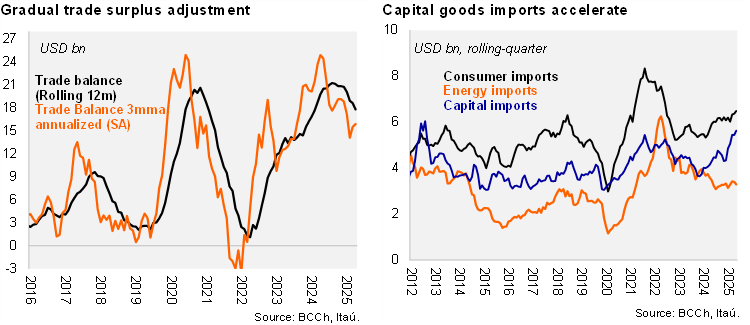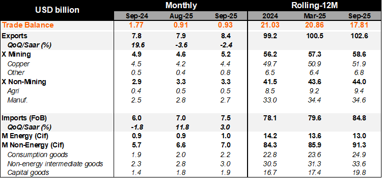 A trade surplus of USD 933 million was recorded in September, a tick above Bloomberg's market consensus of USD 850 million (also our call). The 3Q trade surplus came in at USD 1.8 billion (USD 4.1 billion in 3Q24). As a result, the rolling-12m trade balance reached USD 17.8 billion, compared to USD 19.8 billion in the same period last year. The annualized quarterly trade balance sits at a lower USD 15.9 billion (USD 25 billion cycle peak during late 2024). Exports grew 8.1% year-on-year, boosted by the 10% manufacturing gain, while mining exports grew 4.6% YoY, despite a 2% decline in copper exports. Nevertheless, export growth moderated to 1.9% YoY during 3Q (7.1% in 2Q). On the import side, total imports increased by 24.2% YoY, with capital goods posting a notable gain of 31.2% YoY. YTD growth of capital goods imports sits at 26% YoY, in line with the mining-led investment recovery underway. Consumer goods imports were up 13.3%, while energy goods imports returned to growth. Sequentially, exports contracted 2% QoQ/SAAR, while imports increased 3% QoQ/SAAR.
