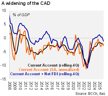 A USD 4.6 billion current account deficit was registered in 3Q25 (Bloomberg consensus: USD 5.0 billion; Itaú: USD 5.5 billion), rising from the USD 2.4 billion deficit in 3Q24, as the goods trade surplus narrowed sharply, in turn driven by the domestic demand recovery. The 2Q CAD was revised down by USD 1.2 billion, in part due to a larger trade surplus. The rolling-4Q current account balance came in at a higher deficit of 2.5% (1.5% in 2024). Sequentially, the CAD in 2Q reached 2.7% of GDP (SA, annualized; 2% in 4Q24). The rising deficit is consistent with the recovery of domestic demand, boosting imports and leading an adjustment of the trade surplus of goods to USD 2.4 billion, (USD 4.8 billion in 3Q24). Nominally, private consumption increased by 7.3% YoY in 3Q, while gross fixed investment rose by 14.4%. Exports increased by 5% YoY (down from 9% in 2Q). The USD 2.3 billion trade deficit in services was in line with 3Q24. Exports were driven by business services, telecommunications, computer and information services, and financial services. Travel services also contributed to the result, in line with inbound tourism in Chile. As for imports, the result reflected the increase in business services, maintenance and repair services, and royalties. Meanwhile, the income deficit is growing (to USD 4.7 billion; USD 4.0 billion in 3Q24) as elevated copper prices boosts FDI investment results. The rise in annual CAD has led to a lower financing coverage by FDI (down to 56%, from 184% in 2024). External debt sits at 78% of GDP, similar to the close of 2024.
