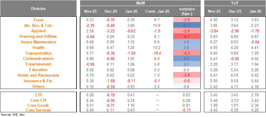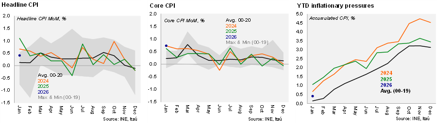 According to the INE, the consumer price index rose by 0.41% MoM in January (Bloomberg median 0.4%, Itaú: 0.38%). While the headline print was essentially in line with our view, core inflation rose by 0.7% MoM, above our 0.5% call, driven mainly by a 1.2% MoM rise in core goods. On an annual basis, inflation fell to 2.8% (3.5% in December) aided by base effects amid the lack of an electricity price adjustment. This is the first time since March 2021 that annual inflation is below the 3% target. Core inflation reached 3.4% YoY (3.3% in December). A key price pull in the month was condominium fees (4.5%), likely reflecting seasonal factors but may also consider lagged second round effects of prior minimum wage hikes and cost pressures. On the core goods front, computers (+8% MoM) and mobile devices (1.2% MoM) played an important role, along with new vehicles (0.8%).