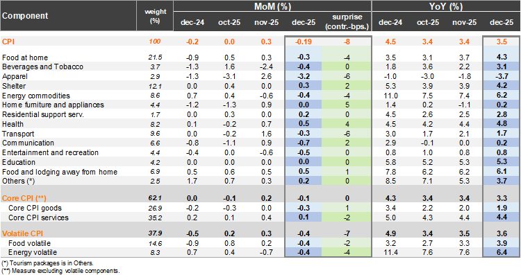 Sequential pressures dropped in 4Q. At the margin, annualized inflation accumulated over the final quarter of last year reached 2.3% (3.7% in 3Q), while core inflation sat at 2.5% (core goods 0.2%, core services 3.5%). Volatile inflation ticked up 0.1pp to 3.6%. Food inflation sits at 4.2% (3.6% in November) and energy inflation reached 6.4% (7.4% in November). Excluding food and energy prices, inflation dropped by 10bps to 2.8%. Meanwhile, nominal wage data for November remained at 5.9%, yet well below the 8.5% in November 2024.