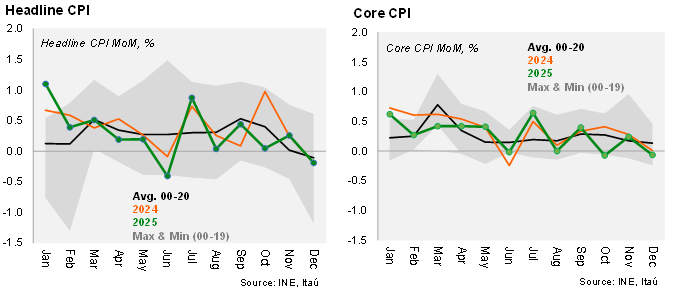 The December downside surprise was mainly explained by volatile items. According to the INE, the consumer price index fell by 0.19% MoM in December, slightly below the Bloomberg median (-0.1%) and our call (-0.12%. Breakevens fell 3bps yesterday to -0.16%. The BCCh’s implicit estimate in the IPoM for December CPI was -0.05%. A key price drag in the month was International Air Travel (-15.9%, partially unwinding the previous month’s surge), along with Telecommunications and certain fruits and vegetables. The bulk of the surprise to our call came from volatile food and energy items. On an annual basis, inflation reached 3.5%, up 0.1pp from November, within the upper half of the 3% inflation target’s tolerance range (+/- 1%). The 3.5% close to 2025 was in line with our call, while a tick below the updated BCCh scenario (3.6%). Core inflation fell by 0.1% MoM, in line with our forecast (-0.06%) but slightly below the BCCh’s implicit IPoM estimate (0.0%). On an annual basis, core fell to 3.3% YoY (BCCh: 3.4%), the lowest since June 2024. Core goods fell at the margin (-0.3% MoM), leading to an annual rise of 1.9%, while core services increased by 0.1% MoM and by 4.4% YoY.