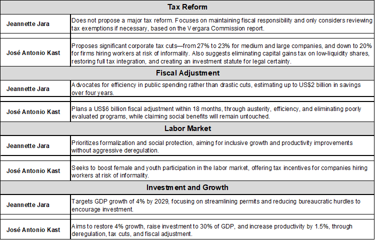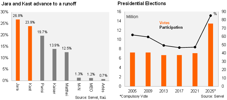 Jeannette Jara underwhelmed at 26.8%, below several polls and the approval of Boric’s administration. José Antonio Kast outperformed relative to polls at 23.9% yet was below the 27.9% of the first-round presidential election in 2021. Franco Parisi unexpectedly surged to the third spot with 19.7% (up from 13% in 2021), well above polls, maintaining support in the northern regions of the country. Parisi avoided endorsing neither Jara nor Kast. Johannes Kaiser, from the National Libertarian party, achieved 13.9%, while the center-right candidate Evelyn Matthei underwhelmed with 12.5% (broadly in line with the performance of Sebastian Sichel in 2021). Both Kaiser and Matthei swiftly endorsed Kast. Polls have consistently shown that Jara would lose to Kast in a second-round vote. The second-round rhetoric will likely focus on measures to address security, economic growth and jobs. The first compulsory presidential vote saw a participation rate of 85.3%, with 13.5 million votes (up from 7.1 million in 2021).