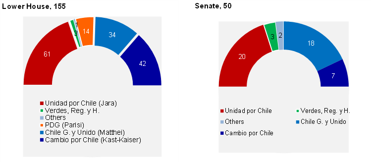 While the presidential race garners the most attention, the composition of Congress is crucial in shaping the next political cycle. The right maintained a sizable share in both houses but did not reach a majority. The two coalitions representing the right obtained a combined 25 spots in the 50-seat Senate, down from its current showing of 27. The governing coalition totaled 20 seats, with the Greens in at 3 seats. Left-leaning independents make up the remaining spots. The 155 seat Lower House saw the political right rising from 73 to 76 spots. The governing coalition dropped from 74 to 61 seats. Greens hold 3 seats. The other significant player is Parisi’s PDG party with 14 seats. With no coalition fully in control of Congress, governing will require negotiation across the political spectrum. To advance constitutional changes a 4/7 majority is required (89 in the House; 29 in the Senate).