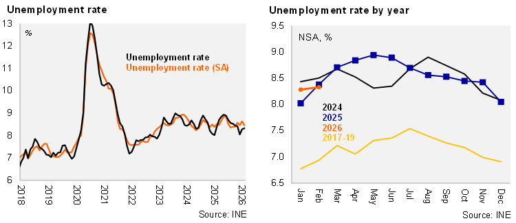 According to the National Statistics Institute (INE), the unemployment rate for the moving quarter ending in February reached 8.3%, slightly below the market expectation of 8.4% (Itaú: 8.5%) and down 0.1 percentage points compared with February 2024. Labor force grew 1.0% YoY (1.4% in January), as did total employment (1.2% in January), driven mainly by the expansion of informal jobs (+2.8%), while formal employment grew 0.3%. By economic activity, health and professional services were key sectors to the annual grow, while public administration destroyed posts. The labor informality rate stood at 26.5%, an increase of 0.4 percentage points over twelve months. At the margin, the unemployment rate reached 8.5%, one-tenth lower than the previous month, although total employment fell 0.1% MoM (0% in January), remaining near the upper limit of the estimated NAIRU range.