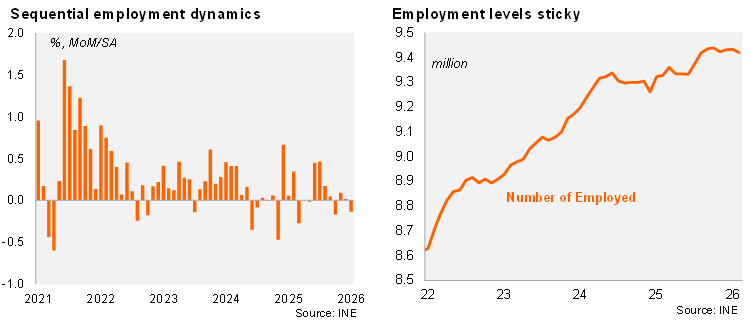 Our take: The labor data reflects a lack of momentum, with job levels roughly stagnant over the last seven months. Unemployment insurance beneficiaries rose 5.9% YoY in January, reinforcing signs of underlying weakness in labor demand. With wage growth set to slow further as inflation spikes, weak activity dynamics are set to persist in the short-term. We expect GDP growth of 2.1% this year (2.5% last year). We preliminary expect the 1Q26 unemployment rate to come in at 8.6% (down 0.1pp from 1Q25). With regards to policy, the Kast administration withdrew from Congress the collective bargaining bill (presented in January 2026) that looked to modify the labor code to allow for collective bargaining to take place at the sector level. Regarding the working week, the government has signaled it will keep the rollout timetable of the 40‑hour law but introduce adjustments to its implementation that include greater flexibility in daily working-hour bands, and changes to how meal breaks are counted within the workday. The administration is expected to detail a National Reconstruction bill, that includes an employment subsidy.