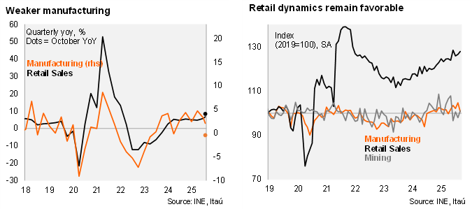 According to the National Statistics Institute (INE), real retail sales rose 8.4% YoY (6.5% in September), well above Bloomberg’s market consensus of 5.4%, and our call of 6.2%. Electronics and household technology (17.4% YoY), apparel and footwear (14.3%) and food (5.1%), with the boost at least partly stemming from cyber sales events during the month (split between September and October during 2024). Sequentially, retail sales rose 1.4% MoM/SA, building on the 1.1% increase in September. Meanwhile, manufacturing output fell 0.4% YoY, below market expectations of +0.9% (Itaú: +0.5%), mainly due to declines in paper manufacturing (-9.4%), pulp production (-8.7%) and machinery and equipment (-17%). Sequentially, manufacturing contracted 0.7% (-3.8% in September). Mining production remained weak (-0.8% YoY), driven by lower ore grades and reduced mineral processing. Mining levels were essentially flat at the margin. Annually, mining has contracted for the past five months. As a result, industrial production declined 0.4% over twelve months, falling 0.3% MoM/SA (-0.5% in September). We expect October Imacec to grow 1.7% YoY (to be released on Monday; 2.7% in September), with non-mining activity a tick above 2%.