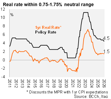 The next rate cut is likely to materialize ahead of the IPoM’s baseline scenario of 2H26. The Central Bank’s Board unanimously left the policy rate at 4.50%, in line with our call and broad consensus. As a result, the one-year ex-ante real rate sits at 1.5%, within the BCCh’s real neutral rate range estimate of 0.75%-1.75%. Importantly, the guidance turned dovish as a swifter disinflation process amid an unsurprising activity evolution called for a review of the required monetary policy response. We believe the Board evaluated a 25bp rate cut at this meeting. The rate path in the Decmber IPoM signaled a final 25bp cut to 4.25% during the latter half of 2026.