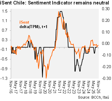 Our Take: A December cut is still on the table. We expect continued soft inflation data relative to the BCCh’s projections (3.7% YE rate versus BCCh’s 4.0%). We forecast core inflation ending the year 10–20bps below the BCCh’s 3.7% estimate. We expect the BCCh’s cycle to conclude in December at 4.5%. This week’s survey of analysts showed 70% of respondents in favor of a December cut. At yesterday’s close, the curve was pricing in half a cut at the last meeting of the year. The December meeting will be held of the 16th.