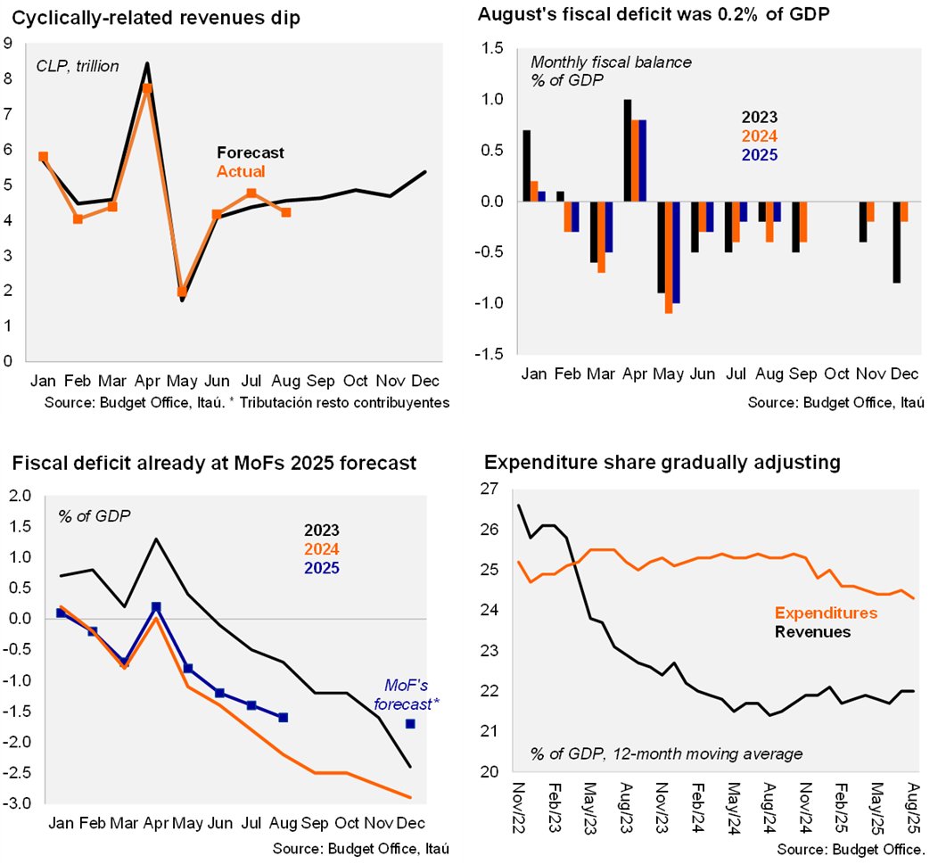 • Again, revenue improvements are taking place in line with our view for the fiscal accounts, leading us to be more constructive than consensus. Still, spending growth will have to contained during election season. Our 2025 nominal deficit forecast of 2.0% of GDP implies a deficit of only 0.4% of GDP for the September-December period, well below the 0.8% of last year during the same period.