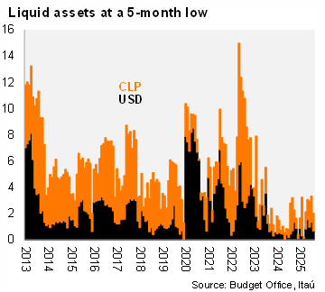 Liquid assets at the Treasury fell at the margin in August. Liquid assets in the Treasury fell at the margin to USD2 billion in August (from USD3.3 billion in July), slightly below July 2024’s level (USD2.8 billion). Despite the sequential decline, cash buffers are improving, driven by debt issuance and greater revenues, as we have mentioned in previous reports. AUM in the sovereign wealth funds were little changed, likely reflecting valuation effects. The Stabilization Fund (FEES) was flat at USD3.86 billion, and the Pension Reserve Fund (FRP) was up slightly to USD9.9 billion. The USD200 million twenty-year loan from the PRF to the social security fund (as part of the implementation of the pension reform) is not reported as a withdrawal, rather still included in the AUM. Loans totaling USD900 million (including this year’s USD200 million) are projected to take place in the following years through 2027; see our report on sovereign wealth funds here.