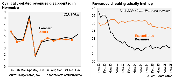 According to the Budget Office’s monthly report: following the October plunge (-10.7% YoY), the Central Government’s real revenues jumped back in November rising by 6.9%. Even though revenues rose, cyclically-related real revenues (tributación resto contribuyentes, comprising roughly 80% of total revenues) disappointed again, falling by 1.4% YoY, a smaller contraction with respect to October (-9.4%), below our forecast for the month (again). However, private mining revenue growth was strong, rising by 51% YoY, taking revenues in the year up by 50.4% YoY, reflecting the first full year of the new mining royalty law, elevated copper prices, and greater copper production. Codelco’s payouts rose by 14% in the month, while property rents (mostly tracked due to its relationship with lithium-related payments) sky-rocketed by 213%, driven by base effects in dividend payments from a SOE. Total real revenues accumulated in the year through November have increased by 5.0% YoY (4.8% as of October), still below the MoF’s annual watered-down revenue forecast (6.8%).