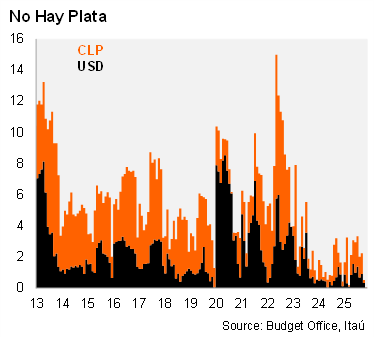 • Dollar sales in 2026: Dollar sales address the government’s gross financing needs, disregarding exchange rate considerations. We estimate gross financing needs (most of which are below the line) close to USD18billion in 2026, which could eventually decline if revenue dynamics improve further, most of which is financed through local currency issuance. Net dollar inflows (primarily from mining-related revenue, foreign currency issuance, and amortizations) should reach at least USD10.1 billion in 2026. Such an amount would allow for the largest dollar sales since 2023 (USD12.2 billion). Having been absent since late October (in the context of critical levels of liquid dollar assets at the Treasury), we expect the MoF to renew dollar sales during the second half of January, maintaining the guidance of up to USD300 million per week. As in previous years, the MoF is authorized to hedge up to USD4 billion in foreign currency debt in 2026; official records suggest the outstanding stock of hedges reach about 3% of gross public debt, roughly USD4.5 billion.