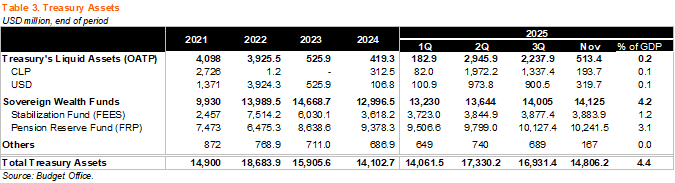 No Hay Plata -- Liquid assets at the Treasury fall to the lowest on record since 2010. Liquid assets in the Treasury fell in November to roughly USD25 million (from USD757 million in Nov-24), the lowest monthly balance on record since 2010. It is no surprise that in this context, the MoF announced a revised larger issuance local currency plan for 4Q25 to complete USD16.7 billion through December. AUM in the sovereign wealth funds were little changed (see table).
