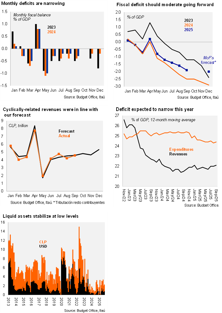 • No surprises at the margin. Revenue improvements are taking place in line with our view for the fiscal accounts, leading us to be somewhat more constructive than consensus. Still, spending growth will have to contained during the final quarter of the year. Our 2025 nominal deficit forecast of 2.0% of GDP is likely to be revised slightly higher; our forecast implies a deficit of only 0.1% of GDP for 4Q25, well below the 0.4% of last year during the same period. The MoF seems set to miss the structural deficit target again this year, eroding the credibility in Chile’s fiscal institutional framework.