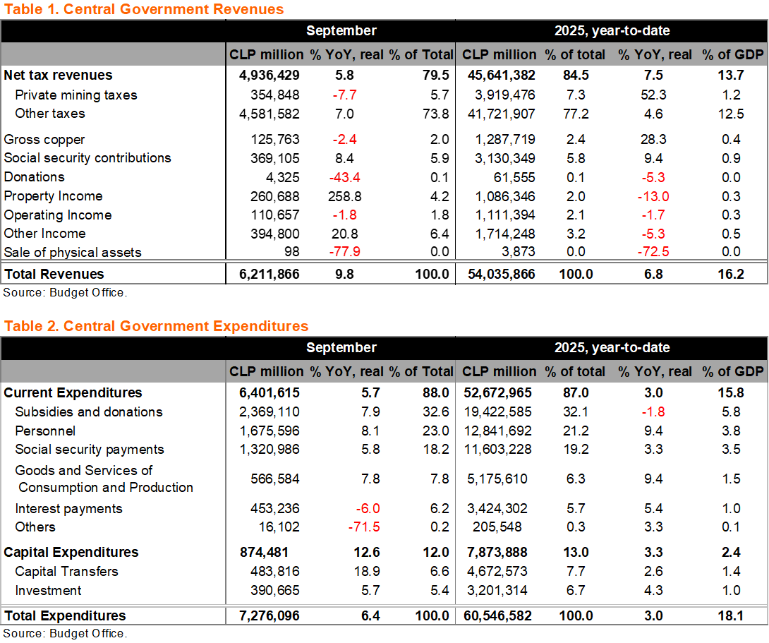 • On policy and reforms: With elections looming on November 16, (tense) discussions in Congress are mainly focused on the 2026 budget, which must be approved by the end of the month. Separately, the revenue-neutral tax reform – according to official estimates – presented by the administration in July (during former Minister Marcel’s tenure), was split; measures that postpone property taxes for households, among others were presented in a separate bill. Measures that enhance this year’s revenues – so called corrective measures – failed to advance materially in Congress. The bill that presents minor modifications to the management of the sovereign wealth funds has yet to be discussed in Congress (see our report on the issue).
