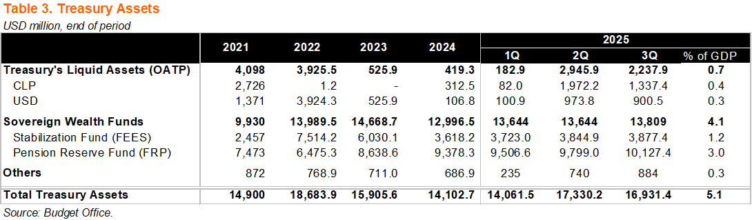 Liquid assets at the Treasury fell slightly in 3Q25. Liquid assets in the Treasury fell in 3Q25 to USD2.2 billion (from USD2.9 billion in 2Q), below 3Q24 (USD3.2 billion). Cash buffers have improved since the critical levels earlier in the year, driven by debt issuance and greater revenues, as we have mentioned in previous reports. AUM in the sovereign wealth funds were little changed, likely reflecting valuation effects. The Stabilization Fund (FEES) was flat at USD3.9 billion, and the Pension Reserve Fund (FRP) was up to USD10.1 billion. The USD200 million twenty-year loan from the PRF to the social security fund (as part of the implementation of the pension reform) is not reported as a withdrawal, rather still included in the AUM. Loans totaling USD900 million (including this year’s USD200 million) are projected to take place in the following years through 2027; see our report on sovereign wealth funds here.