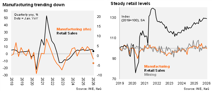 January data suggests that marginal momentum is softening. Retail sales posted a 3.4% QoQ/SAAR increase in the quarter ending in January, down from the 8.1% recorded in 4Q25. Meanwhile, manufacturing production contracted 5.7% QoQ/SAAR (following -8.3% in 4Q25), extending its sequential weakness. Mining output grew 4.7% QoQ/SAAR (+5.6% in 4Q25), resulting in overall industrial production showing a slight contraction of 0.1% (-1.1% in 4Q25).