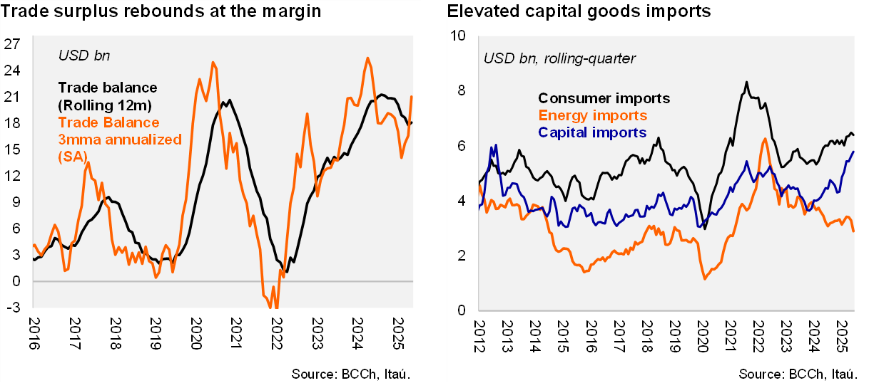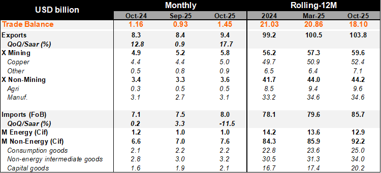A trade surplus of USD 1.45 billion was recorded in October, above the Bloomberg market consensus of USD 1.1 billion, while in line with our call (USD 1.3 billion). As a result, the rolling-12m trade balance reached USD 18.1 billion, ticking up from a recent dip (USD 21 billion in 2024). The annualized quarterly trade balance sits at a lower USD 21 billion (USD 25 billion cycle peak during late 2024). Exports grew 14% year-on-year, boosted by the 19% mining gain. On the import side, total imports increased by 12% YoY, with capital goods posting a notable gain of 30% YoY, boosted at the margin by energy related equipment, and overall in line with the investment-led recovery underway. Consumer goods imports were up 5%, while energy goods imports contracted by double-digits. Sequentially, exports increased 18% QoQ/SAAR, while imports fell by 12% QoQ/SAAR.