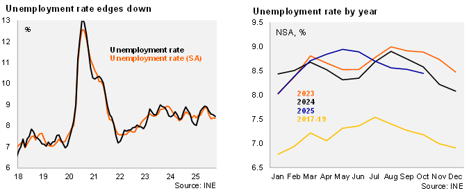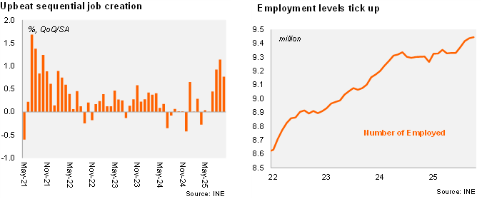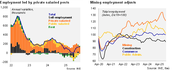 The unemployment rate reached 8.4% in October quarter (8.5% in Oct-24), a tick below the Bloomberg market consensus was 8.5%, while in line with our call. Employment rose 1.5% YoY (in line with 3Q growth), while the labor force increased 1.3% (1.2% in 3Q).On a seasonally adjusted basis (SA), employment growth was 0.1% MoM/SA, and 0.8% over the last quarter. As a result, the unemployment rate (SA) dropped by 0.5pp since 2Q25 to 8.4%. Labor market informality sits at 26.2%, down 0.9pp over one year. The annual employment change continues to show an offset between positive formal job creation (+180 thousand YoY), lifted by the private sector and self-employment, and a decline in informal posts (-43 thousand YoY). Administrative services, health and transportation were key job creating sectors over twelve months, while construction and public administration retreated.